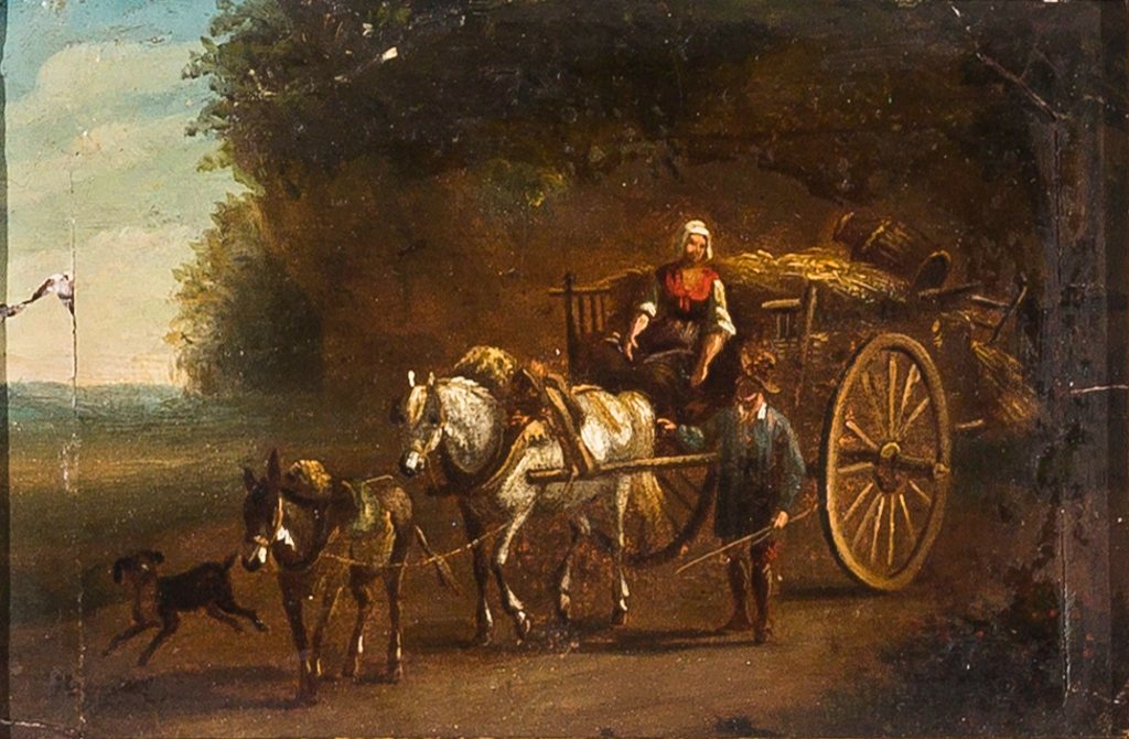 German School, 19th Century | Beladener Heuwagen, Pferd und Esel auf dem Heimweg (1800) | MutualArt