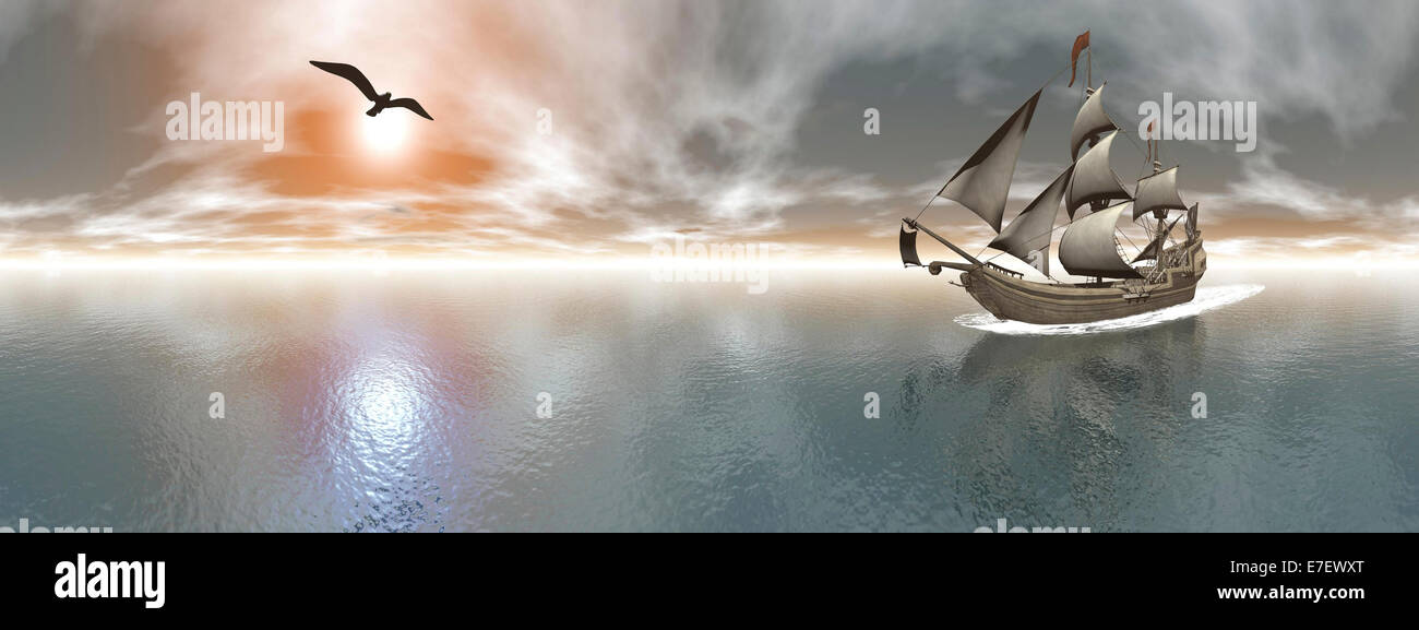 Alten Piratenschiff Segeln auf dem Meer bei Sonnenuntergang ...
