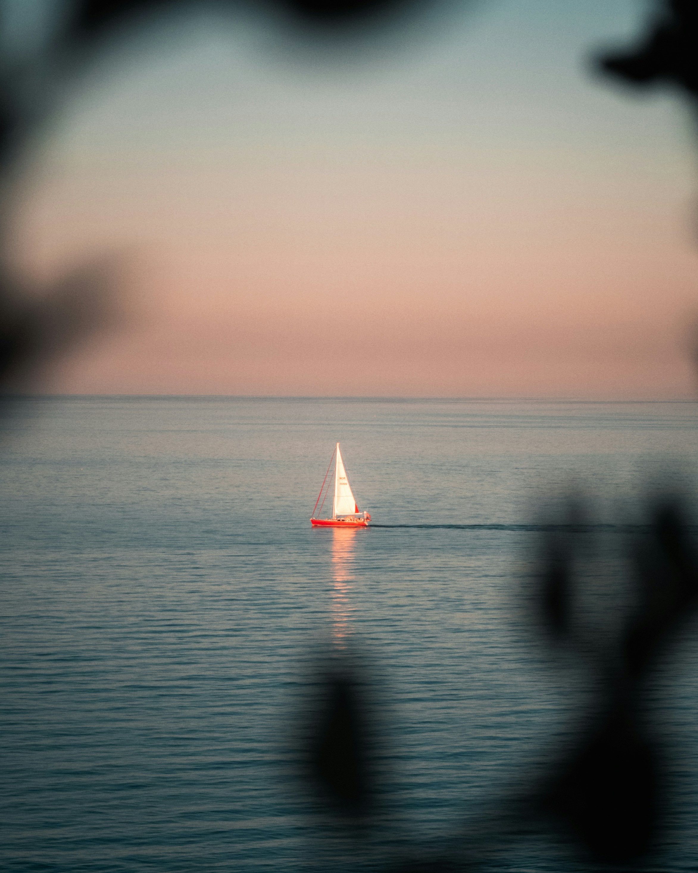 Red Sailboat Sailing at Sunset