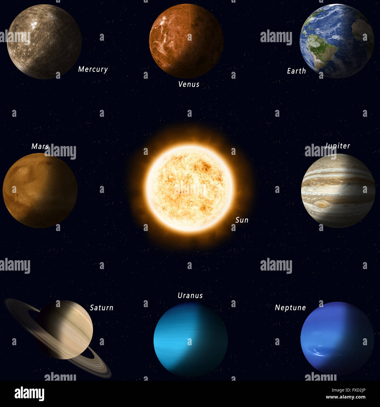 Alle Planeten des Sonnensystems mit Namen und Sonne in der Mitte Stockfotografie - Alamy