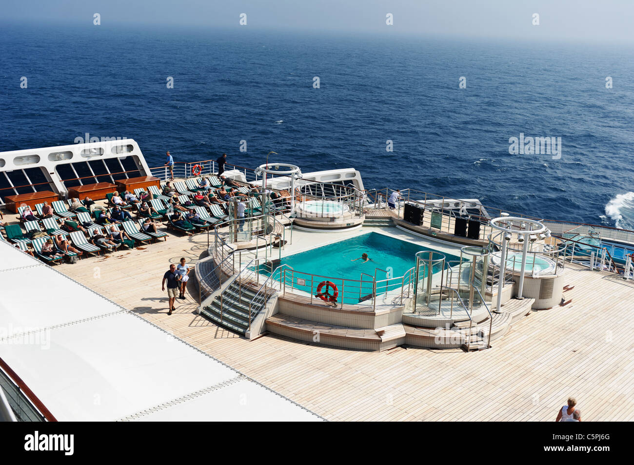 Passengers sunbathing by swimming pool, Queen Mary 2 Ocean Liner Stock Photo - Alamy