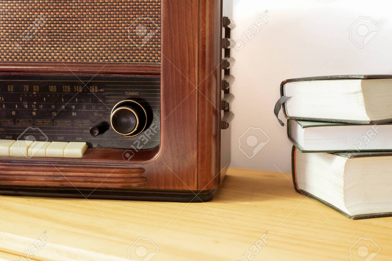 Vintage-Radio Aus Holz Und Alten Büchern Auf Einem Tisch ...