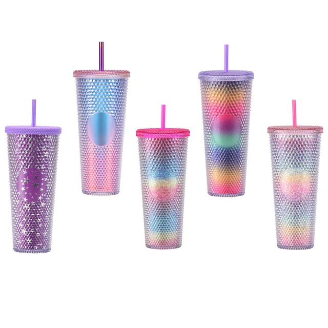 Doppelwandig 710ml 24oz Noctilucence Kunststoff Diamant becher Farbverlauf Regenbogen farben bling besetzt Stroh kalt Tasse ohne Logo - AliExpress