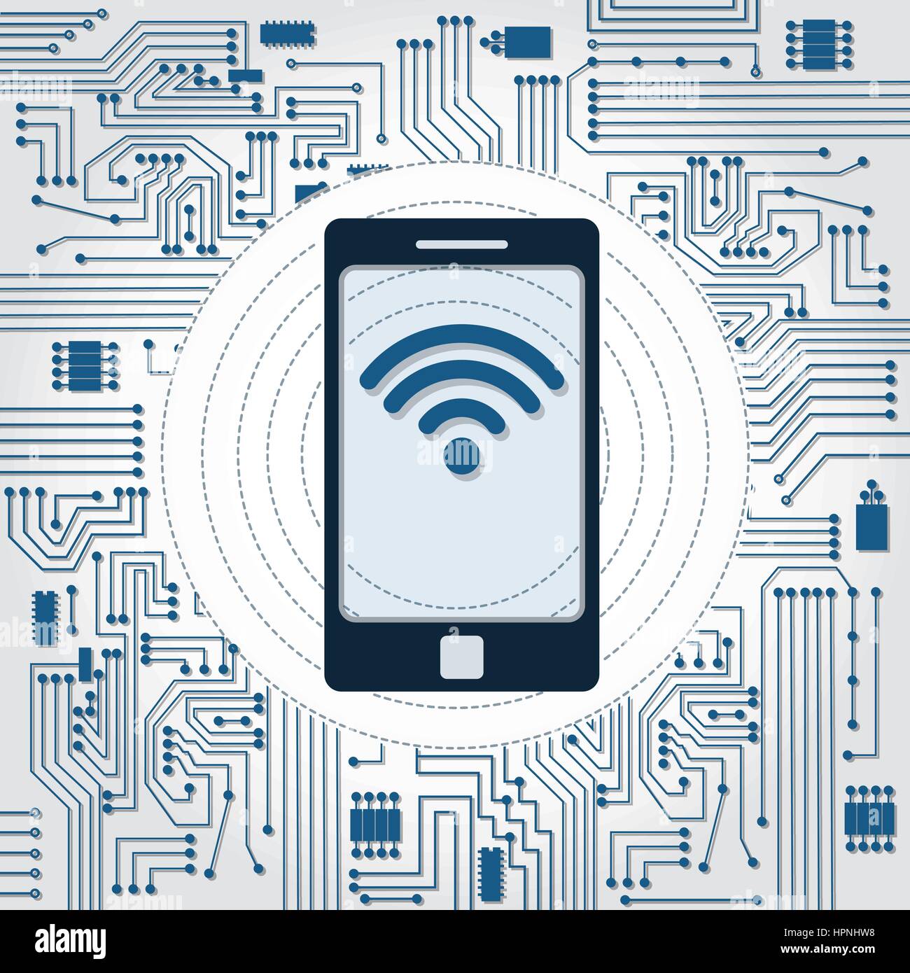 Elektronik Schaltung Hintergrund mit einem Handy mit WLAN ...