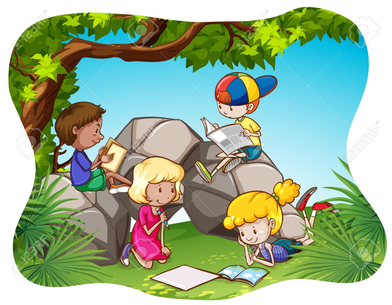 Kinder Lesen Und Schreiben Im Park Lizenzfrei nutzbare SVG, Vektorgrafiken, Clip Arts, Illustrationen. Image 40710909.