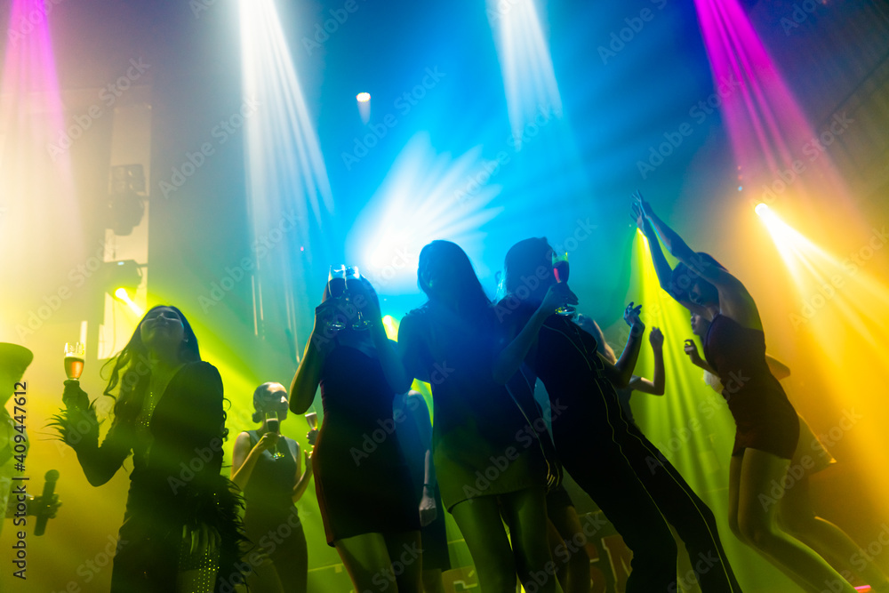 Silhouette image of people dance in disco night club to music from DJ on stage . New year night party and nightlife concept . Stock Photo | Adobe Stock