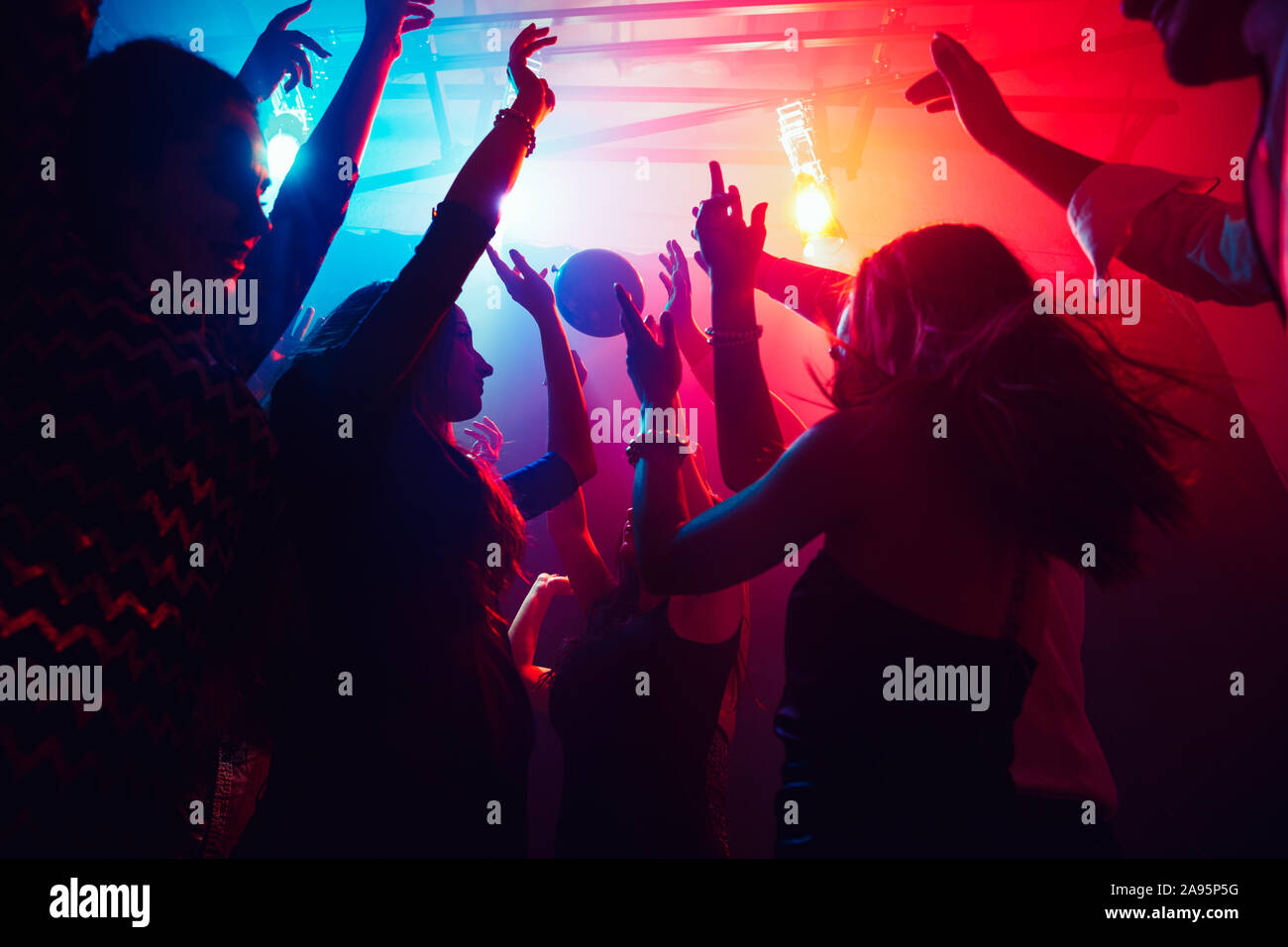 Celebrate. A crowd of people in silhouette raises their hands, dancing on dancefloor on neon light background. Night life, club, music, dance, motion, youth. Bright colors and moving girls and boys Stock