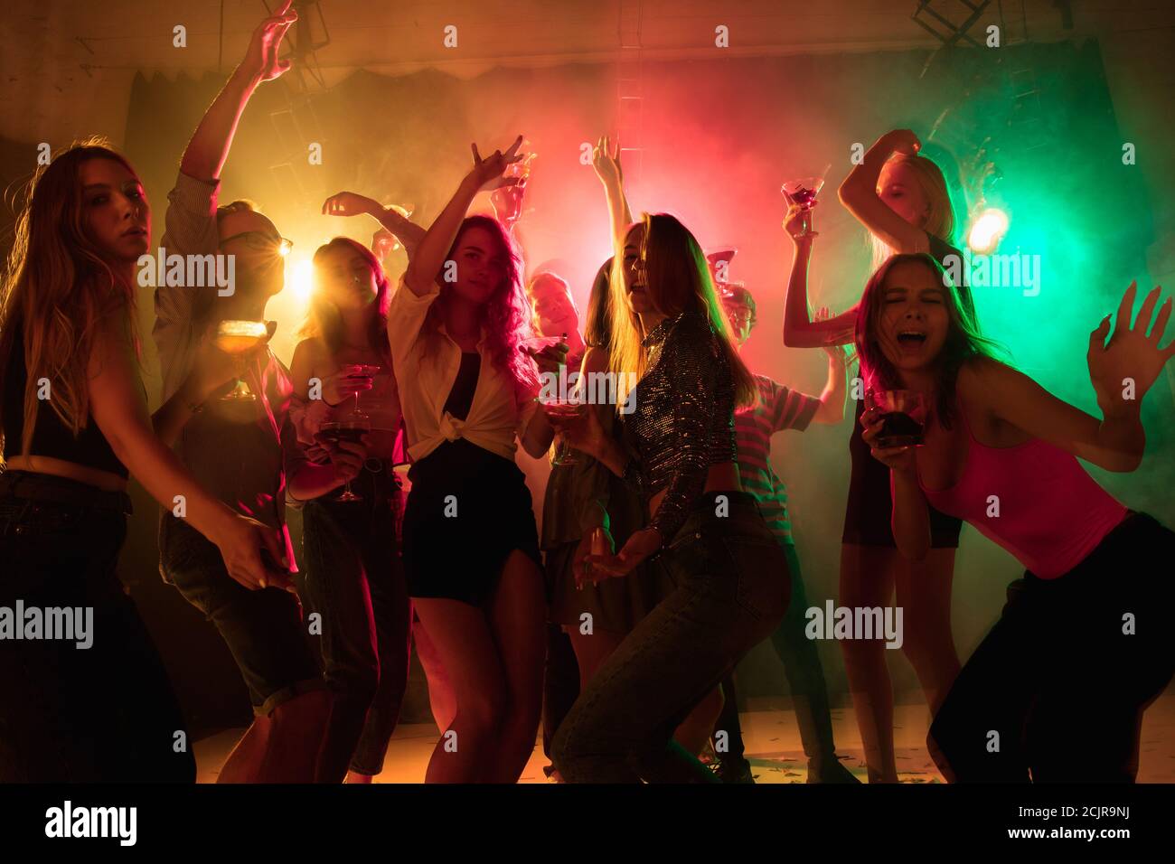 Cocktail. A crowd of people in silhouette raises their hands, dancing on dancefloor on neon light background. Night life, club, music, dance, motion, youth. Bright colors and moving girls and boys Stock