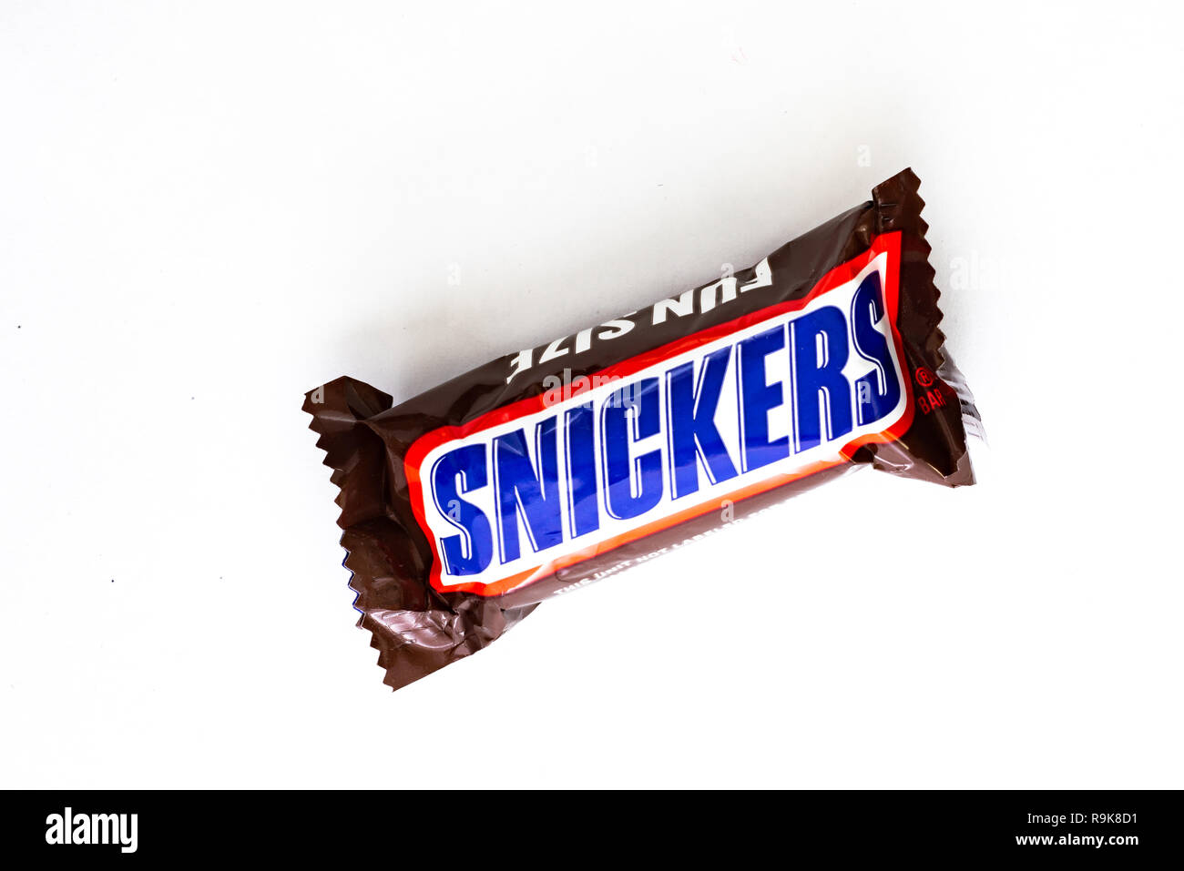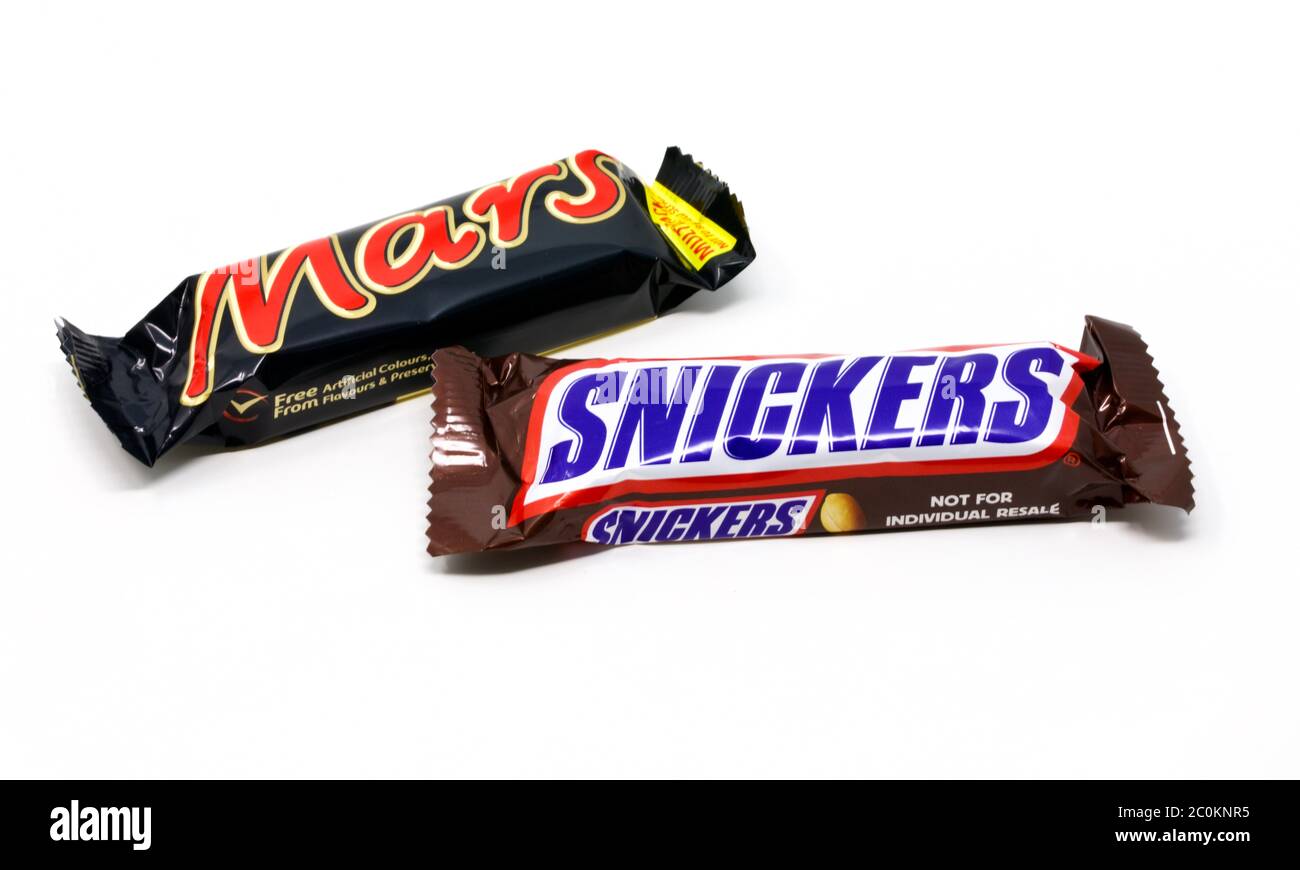 SCHOKORIEGEL SNICKERS auf weißem Hintergrund isoliert. Snickers ist eine Marke von Mars Incorporated Stockfotografie - Alamy