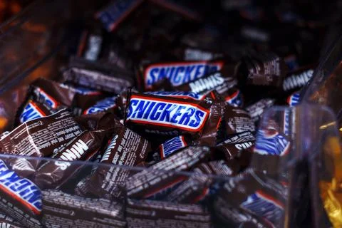 KHARKOV, UKRAINE - 2. OKTOBER 2019: Viele Snickers Schokoriegel Liegen Auf Pastellorangem Papier. Snickers Bars Werden Von Mars Incorporated Hergestellt. Snickers Wurde 1930 Von Franklin Clarence Mars Erfunden Lizenzfreie Fotos, Bilder und Stock ...