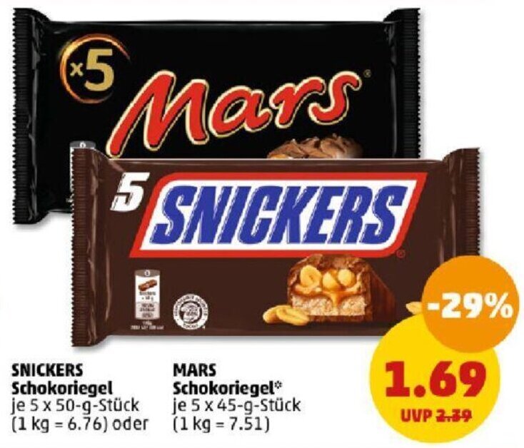 SNICKERS Schokoriegel 5 x 50-g-Stück oder MARS Schokoriegel 5 x 45-g-Stück Angebot bei PENNY