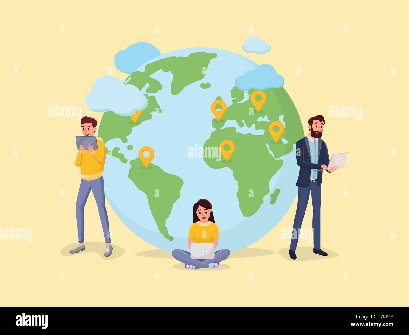 Planeten Erde mit Menschen, die mit einem Computer und social ...