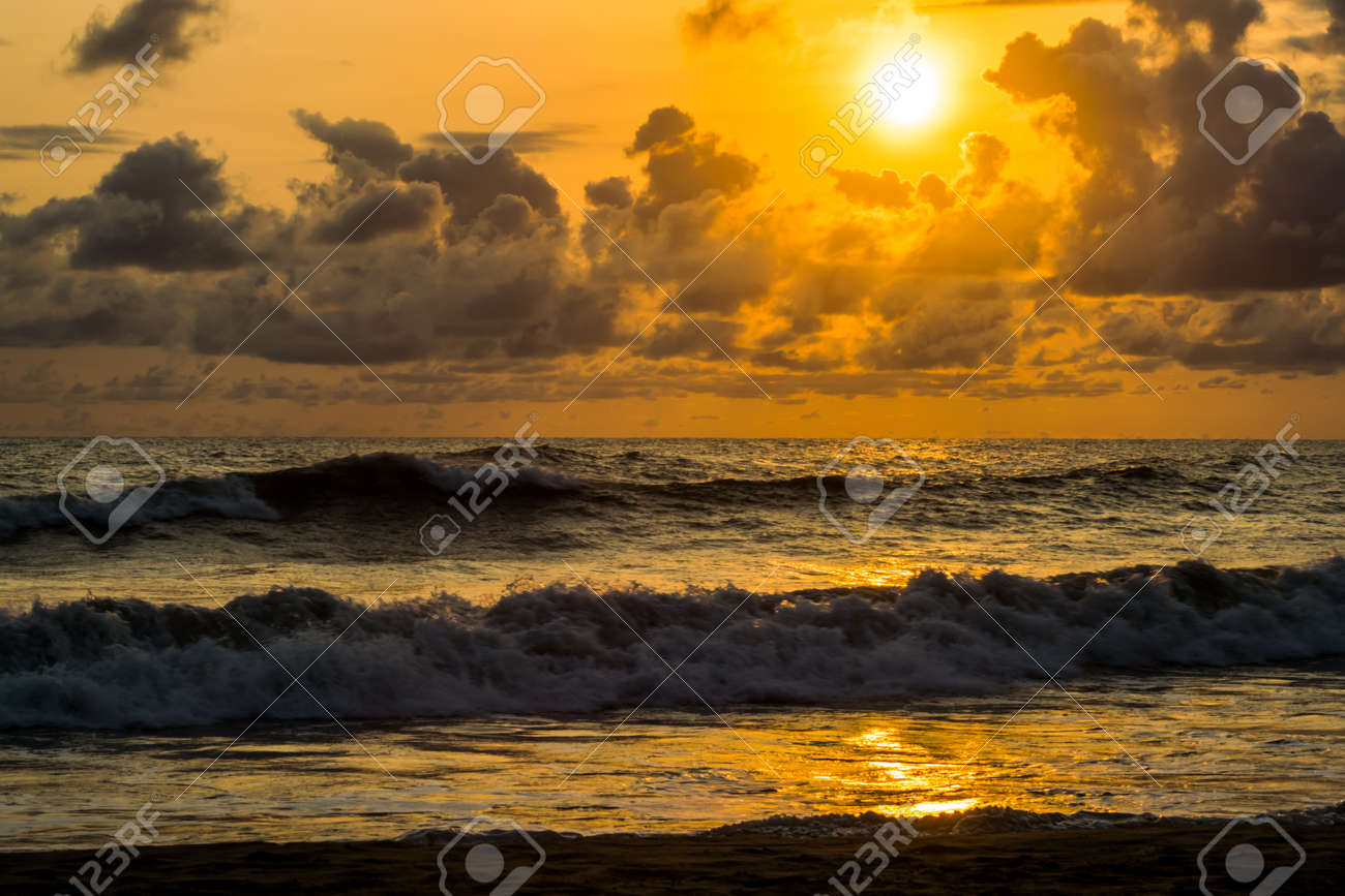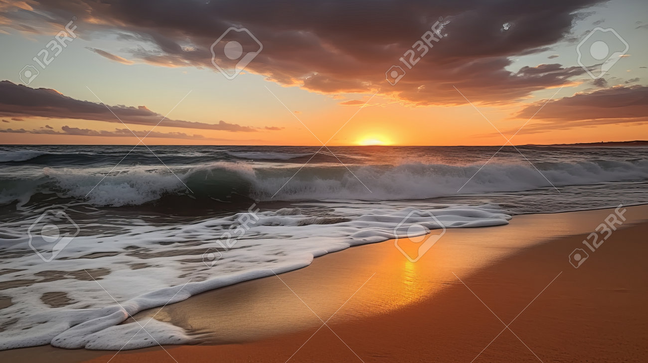 Sonnenuntergang am Strand. malerische seelandschaft mit wolken, wellen und sonne. 16248194 Stock-Photo bei Vecteezy