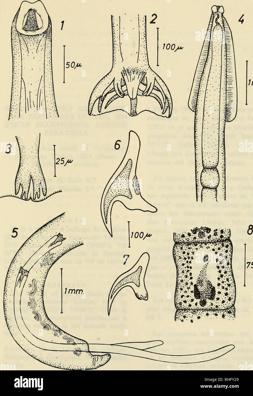 Boletin de la Sociedad de Biología de Concepción. Sociedad de Biología de Concepción; Biology; Biology. s Jmm.. 750/u^ Figs. 1-3: Uncinaria stenocephala. Fig. 1.- Extremo anterior; Fig. 2.- Bursa copulatriz; Fig.
