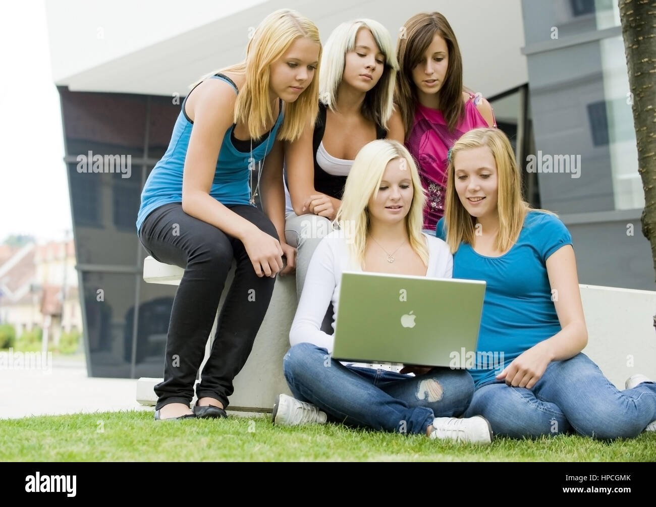 Model released , Gruppe jugendlicher Maedchen mit Laptop - group of teenage girls using laptop Stock Photo - Alamy