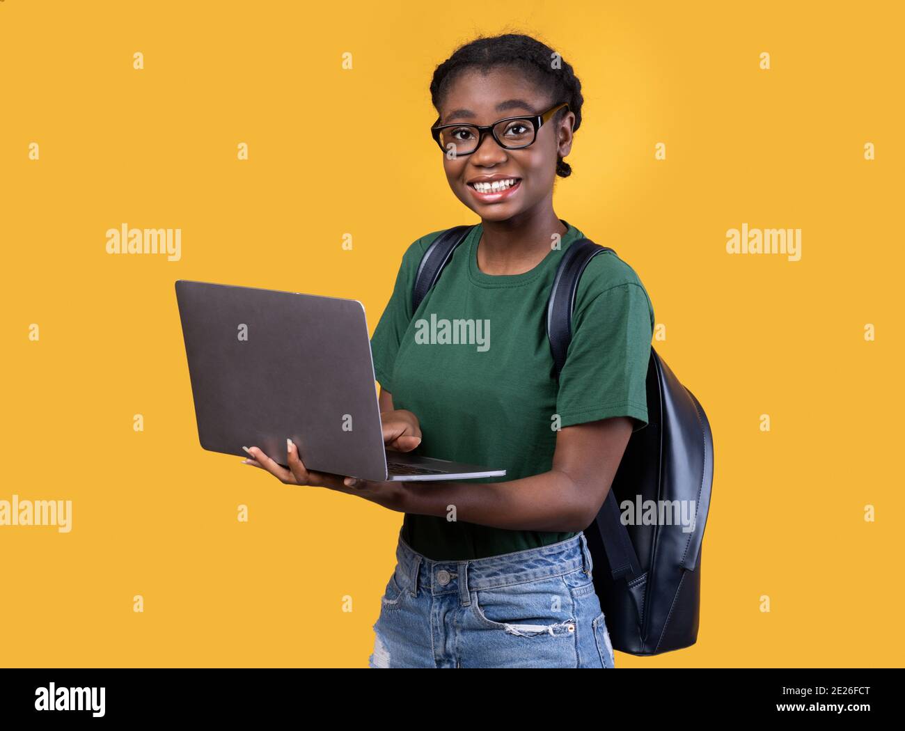 Happy Black Student Girl Mit Laptop-Computer Über Gelben Hintergrund Stockfotografie - Alamy