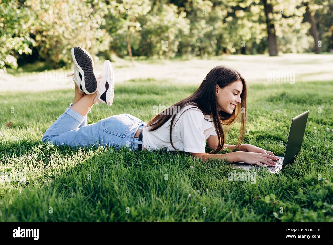 Student Mädchen mit Laptop im Freien. Lächelnde Frau, die mit einem Computer auf dem Gras liegt, im Internet surft oder sich auf Prüfungen vorbereitet. Technologie, Bildung Stockfotografie - Alamy
