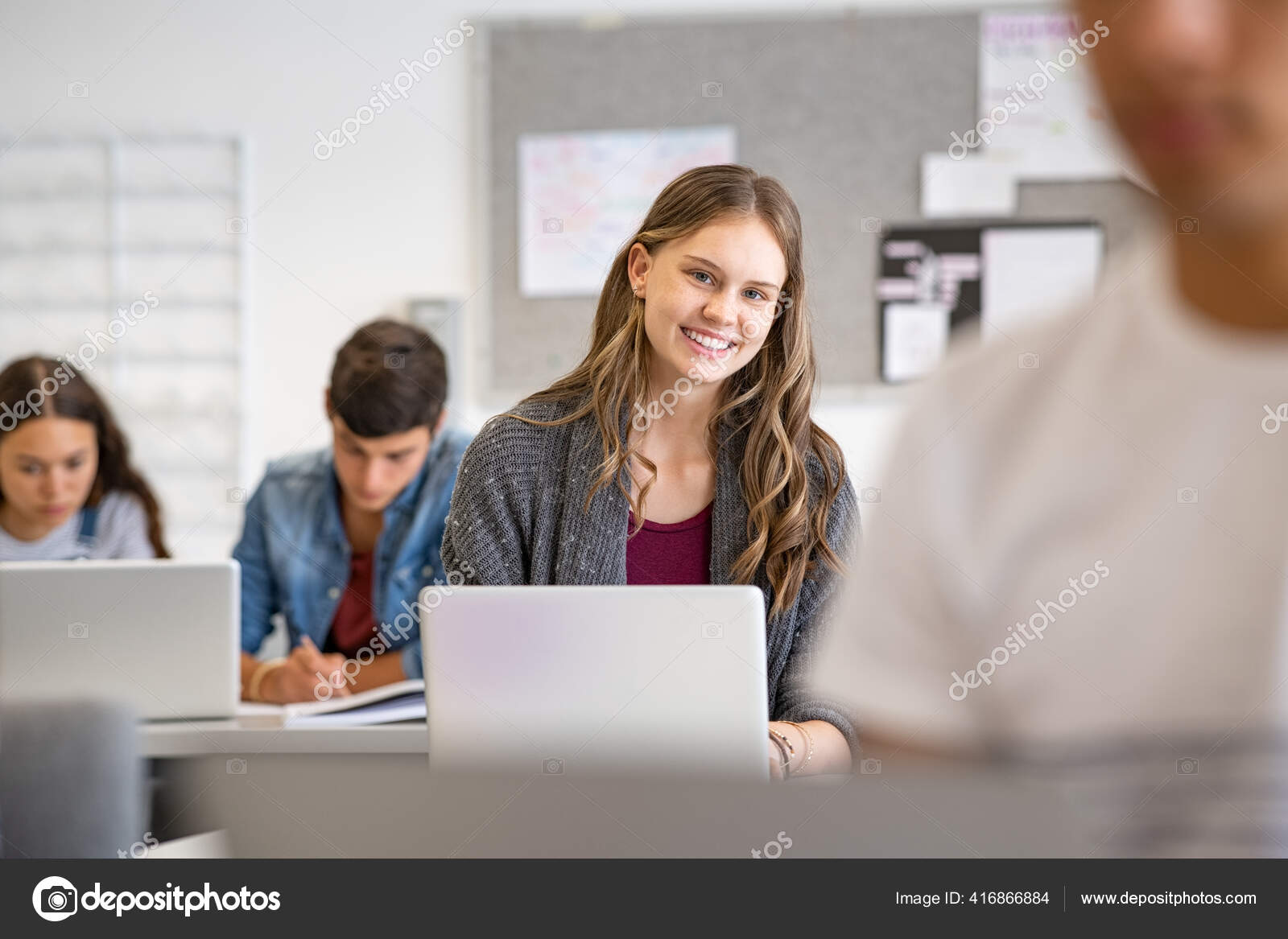 Student Mit Einem Laptop In Der Klasse, Die Als Team Mit Anderen Studenten Zusammenarbeitet Lizenzfreie Fotos, Bilder und Stock Fotografie. Image 56781368.