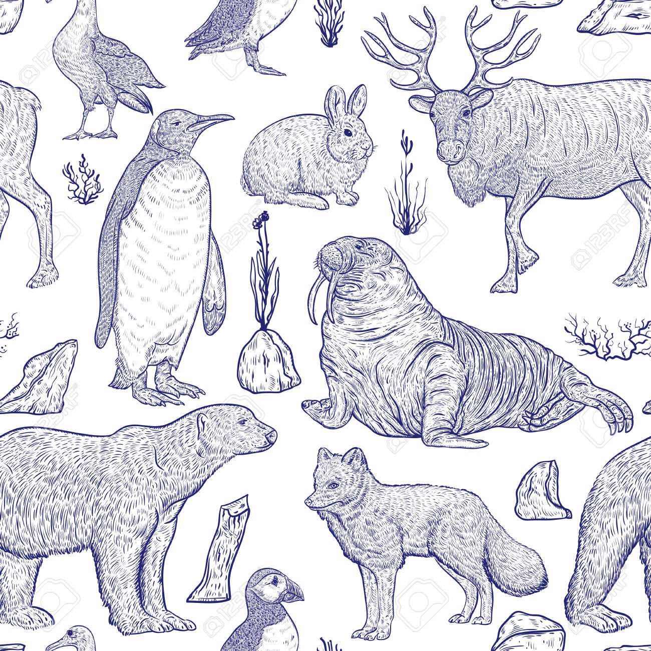 Nahtloses Muster Mit Arktischen Tieren. Schneehase, Polarfuchs, Albatros, Weißer Bär, Nordren, Pinguin, Papageientaucher, Walross Und Tundra Pflanzen Und Eisberge. Vektor-illustration Lizenzfrei nutzbare SVG, Vektorgrafiken, Clip Arts, Illustrationen ...
