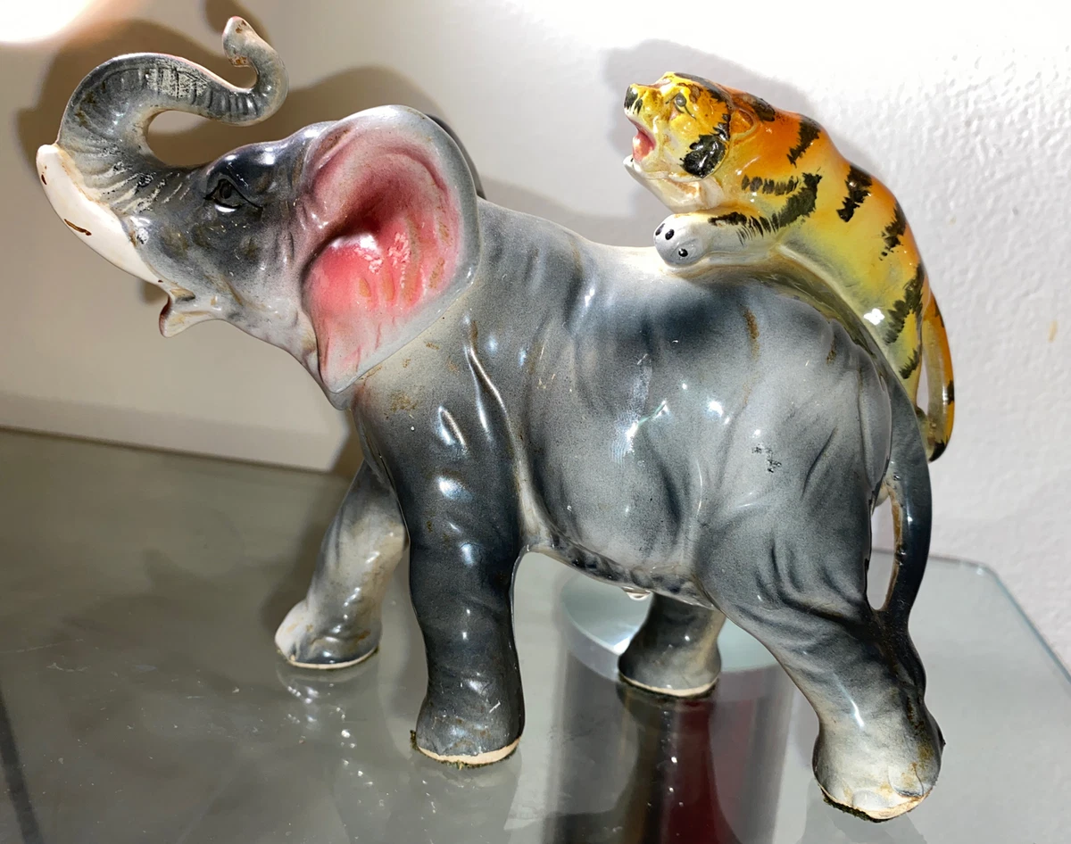 Vintage Ceramic Elephant with Attacking Tiger On Its Back Figurine