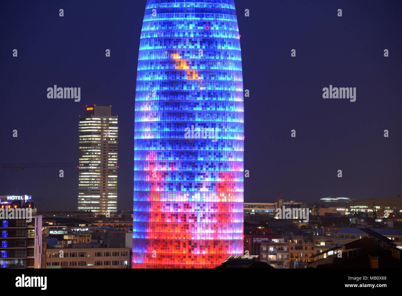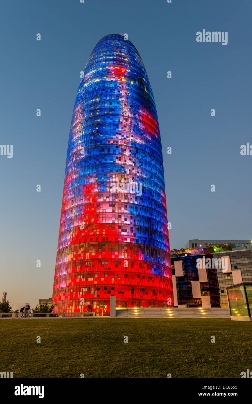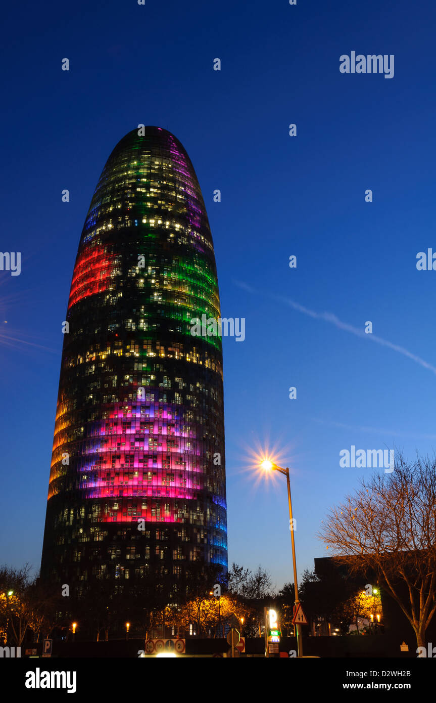 Der Torre Agbar, Barcelona, Up lite nachts in atemberaubenden Farben Stockfotografie - Alamy