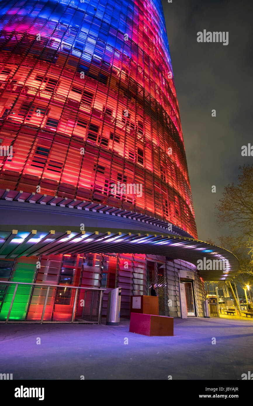 Der Torre Agbar Eingang an Diagonal, Barcellona, lite bis in die Nacht in stumming Farben Stockfotografie - Alamy