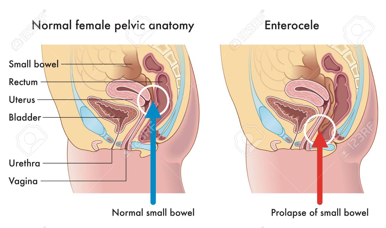 Die Medizinische Illustration Zeigt Die Weibliche Beckenanatomie, Eine Mit Normalem Dünndarm, Verglichen Mit Einer Mit Dünndarmprolaps Namens Enterozele. Lizenzfrei nutzbare SVG, Vektorgrafiken, Clip Arts, Illustrationen. Image 151774867.