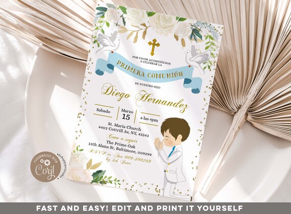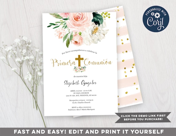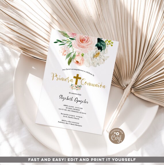 BEARBEITUNGSFÄHIGE italienische Erstkommunion Einladung, Floral Pfirsich Einladung zur ersten heiligen Kommunion, spanische Taufeinladung, 1.Kommunion Ev124 - Etsy.de