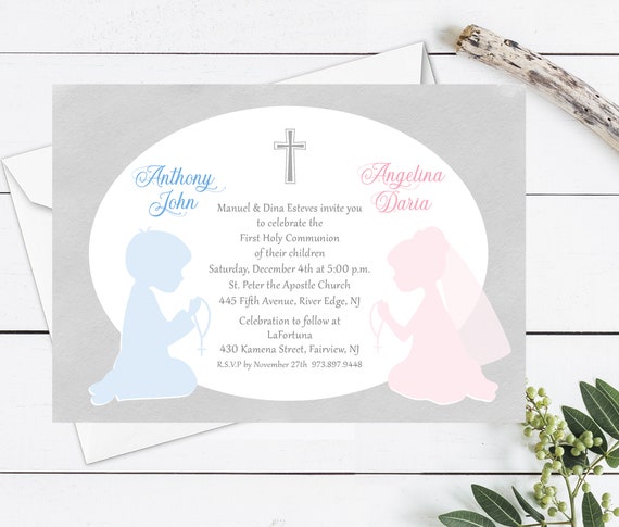 Zwillings-Kommunion-Einladung, graue Geschwister-Einladung zur ersten Kommunion, graue Damast-Kommunionseinladung, gemeinsame Kommunion-Party zum Ausdrucken, Silber - Etsy.de