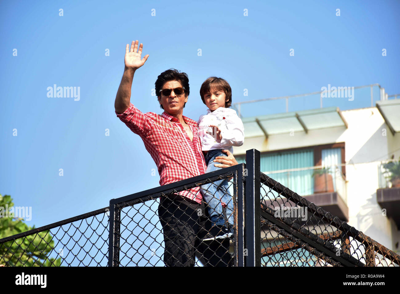 Shah Rukh Khan winkt, um von oben Balkonzaun zu Menschen unterhalb seines Mannat Bunglow in Bandra Mumbai Indien zu drängen Stockfotografie - Alamy