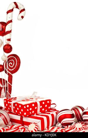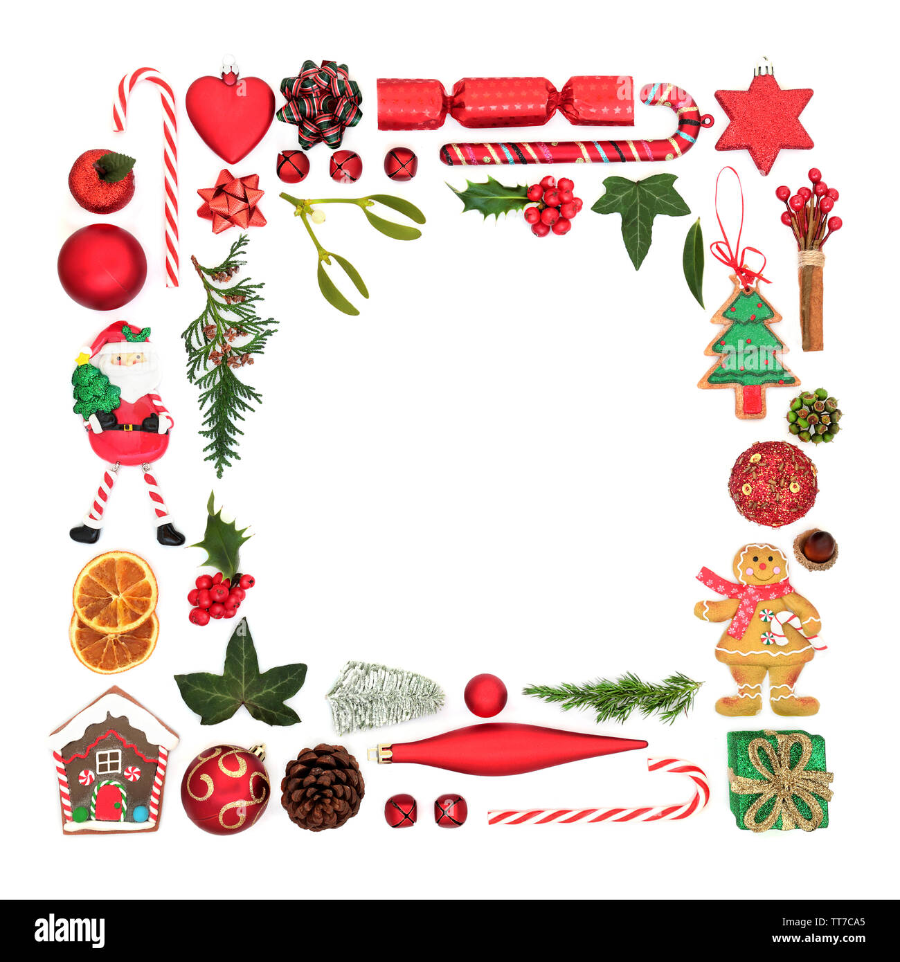 Festliche Weihnachten Hintergrund Grenze mit Christbaumschmuck, winter Flora, Essen und Symbole auf weißem Hintergrund mit kopieren Stockfotografie - Alamy