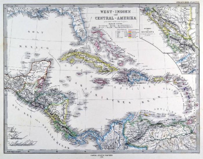 KARIBIK. - Karte. - "West-Indien und Central-Amerika". Karibik mit zwei Nebenkarten (Isthmus von Nicaragua und von Panama).