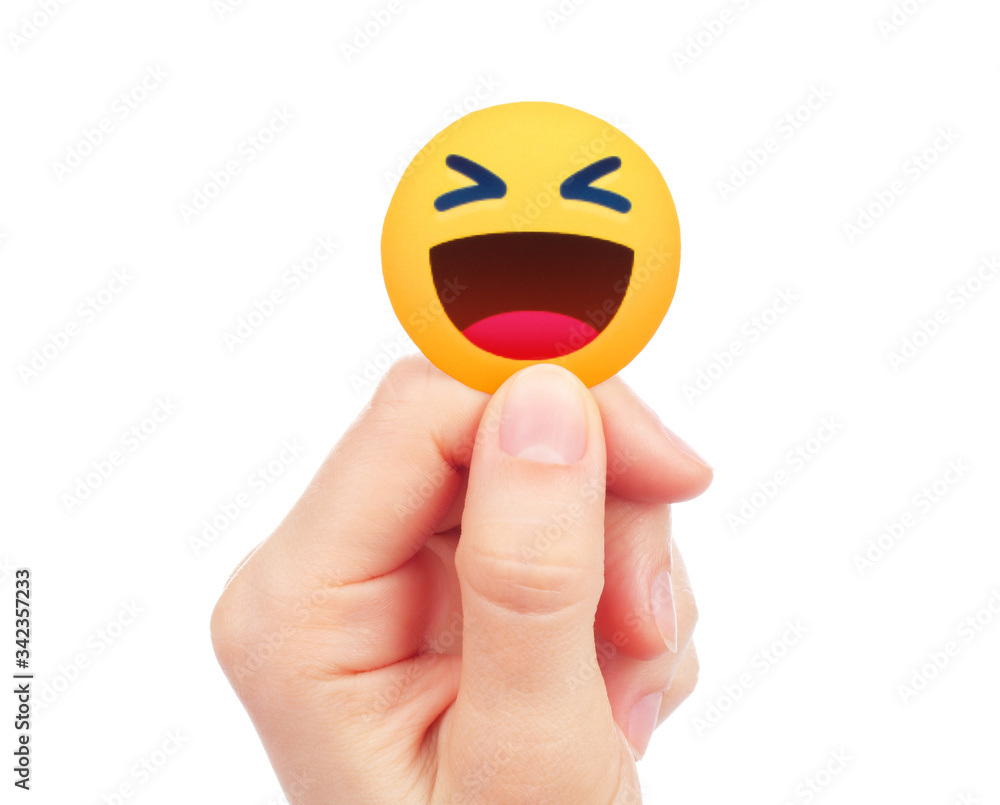 Hand holds new Facebook Haha Empathetic Emoji Reaction Stock-Foto ...