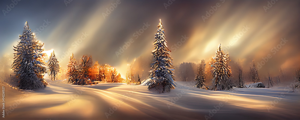 Märchenhafte Winterlandschaft Hintergrundbild mit Schnee und Bäume in einer epischen Lichtstimmung, Winter Wunderland Stock-Illustration | Adobe Stock
