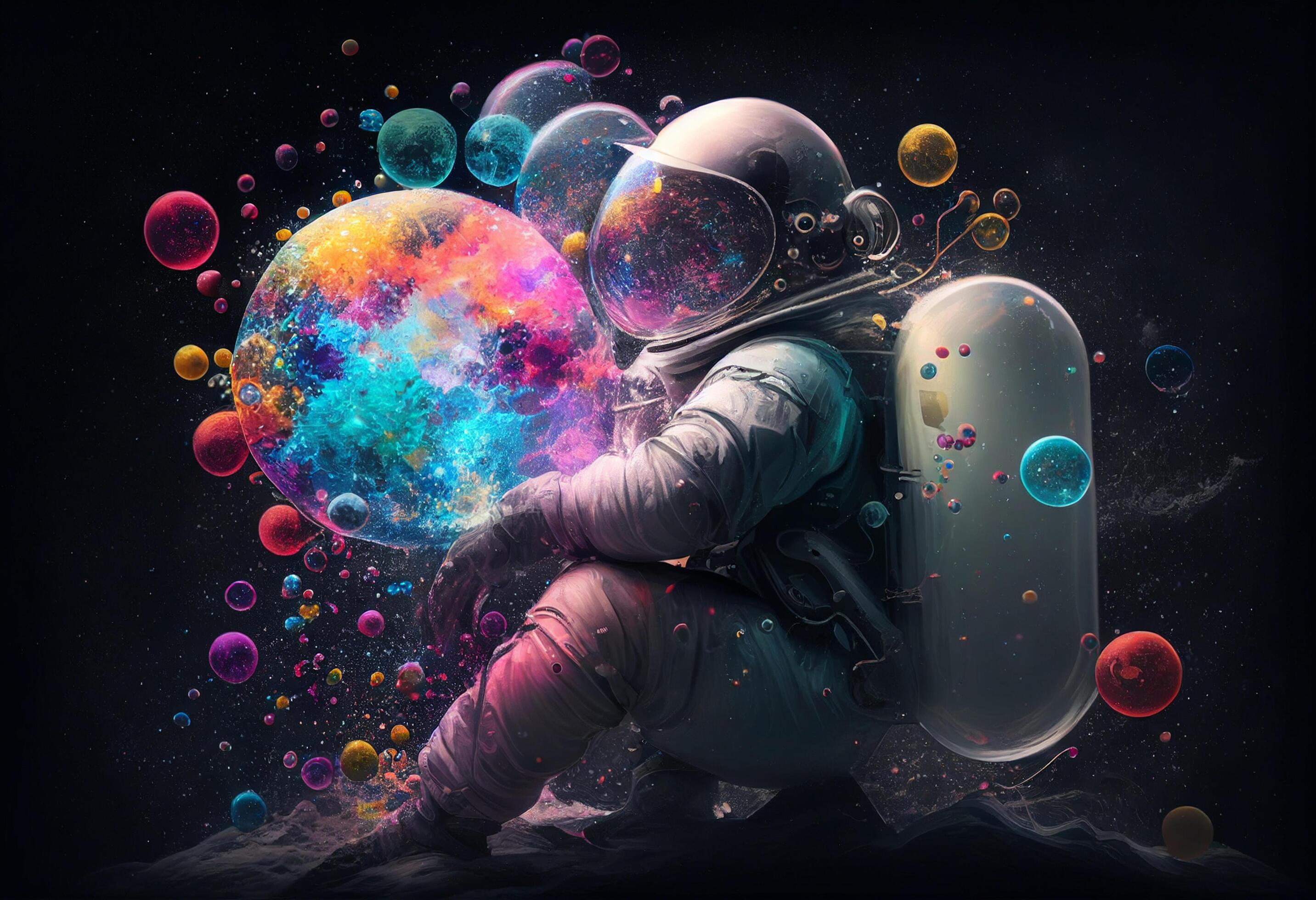 Astronaut in outer space with colorful planet. 3D rendering ...