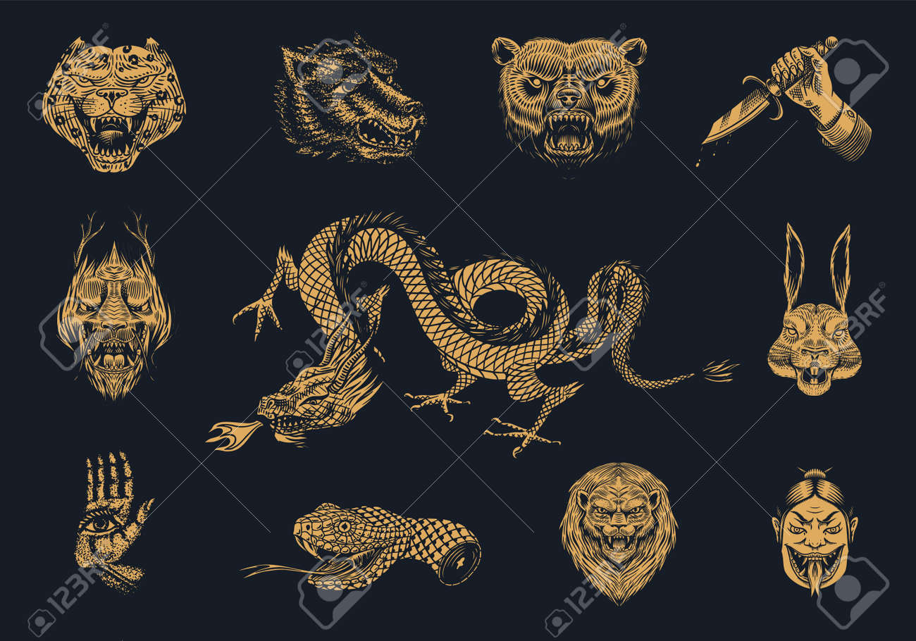 Reihe Von Mode-Patches. Tattoo-Kunstwerk. Bär Drache Löwe Schlange Dolch Hase. Handgezeichnete Gravur In Alter Vintage-Skizze. Vektor Surreale Illustration, Abzeichen, Druck Für T-Shirt. Lizenzfrei nutzbare SVG, Vektorgrafiken, Clip Arts ...
