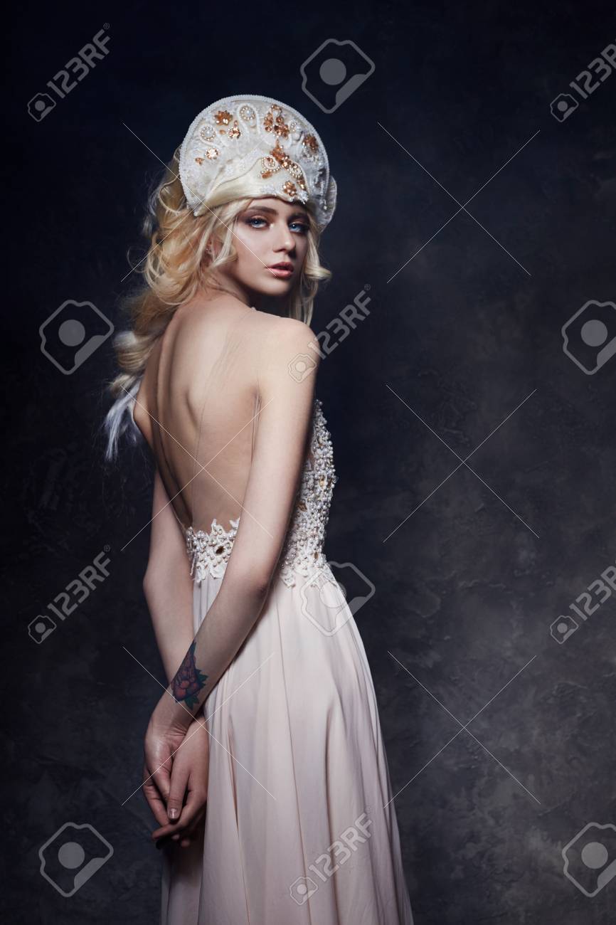 Schöne Blonde Frau Im Kleid Mit Nackter Rückseite Und Einer Tiara Auf Ihrem Kopf Fabelhafte Fee Mit Langen Blonden Haaren. Weiche Haut Und Schönes Make-up Lizenzfreie Fotos, Bilder und Stock Fotografie. Image