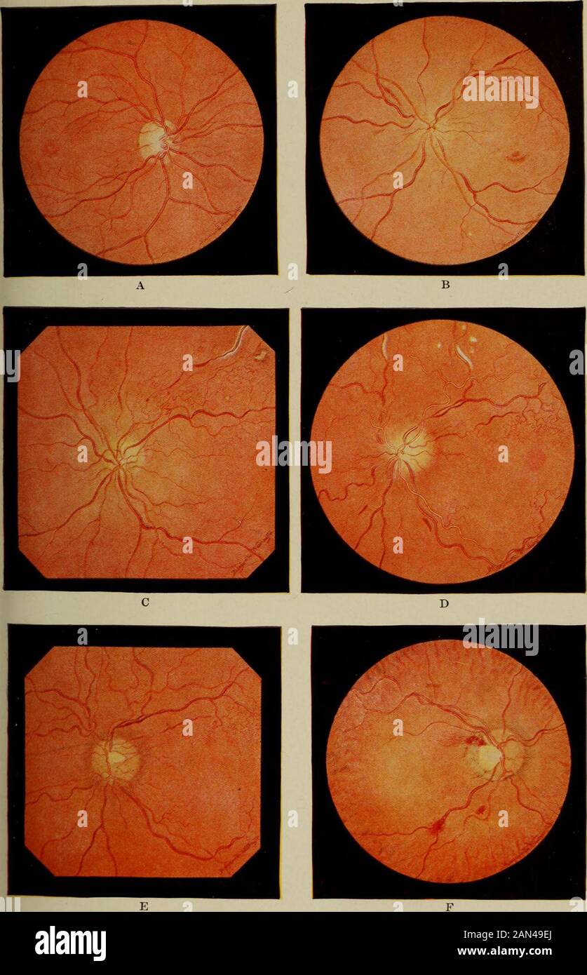 Text-book of ophthalmology . ften fall into the mistake of considering a very vividly red eyegroundas hyperaemic. The aggregate tint of the eyeground, however, depends on its pigmentcontent, and the background of
