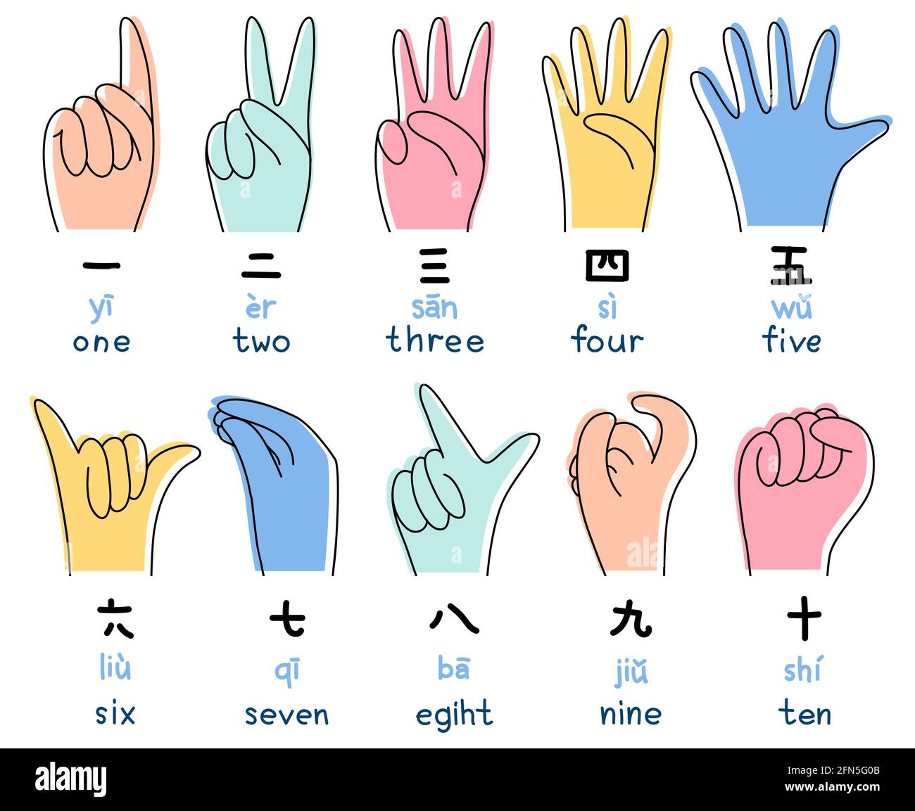Chinesische, japanische Zahlen mit Händen Vektor-Illustration in Doodle-Stil. Benennung von Zahlen mit Händen, Gesten. Zählen bis zu zehn - Hände, Hieroglyphen Stock-Vektorgrafik - Alamy