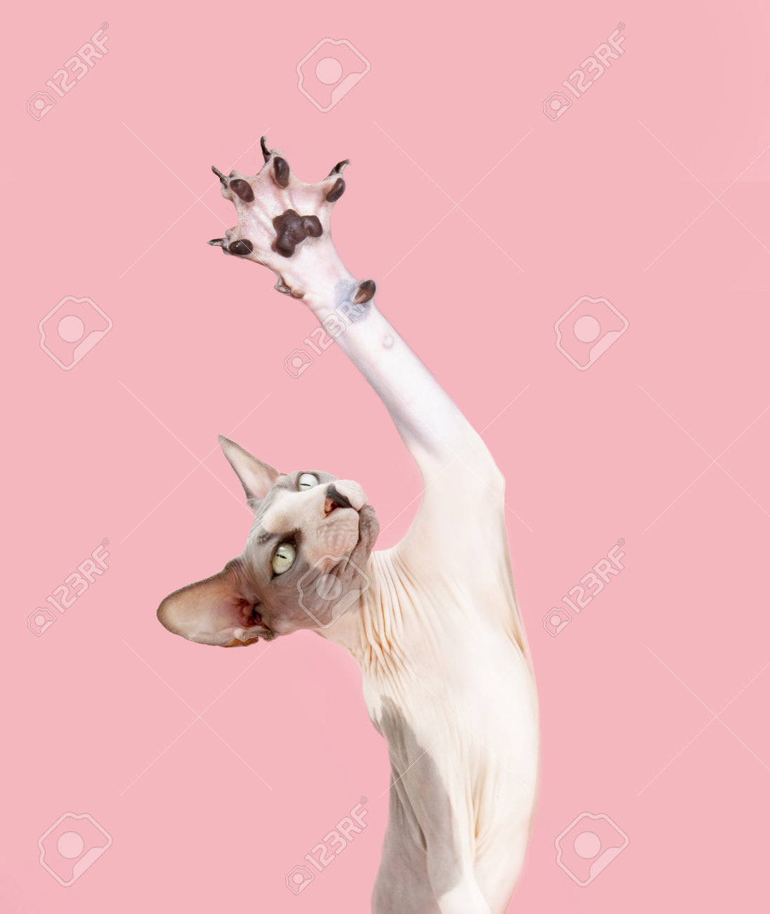 Portrait Lustige Sphynx-Katze High-Five. Isoliert Auf Rosa Pastellhintergrund Lizenzfreie Fotos, Bilder und Stock Fotografie. Image 189798800.
