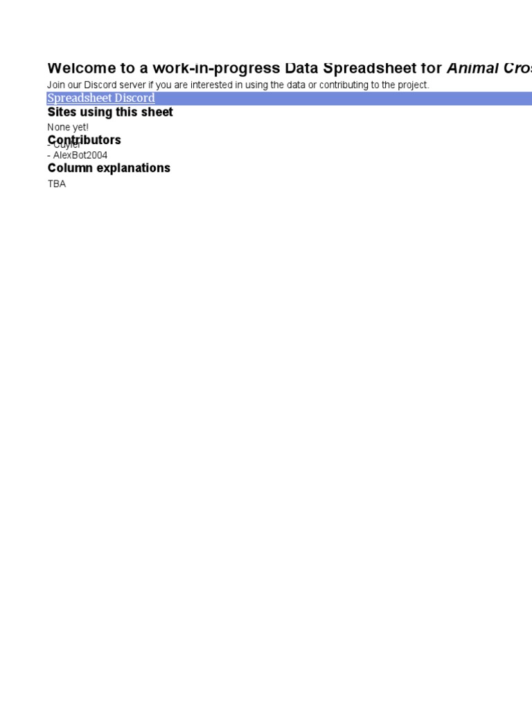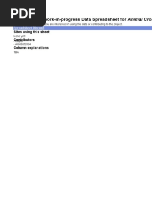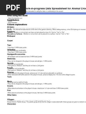 Data Spreadsheet For Animal Crossing - Wild World | PDF