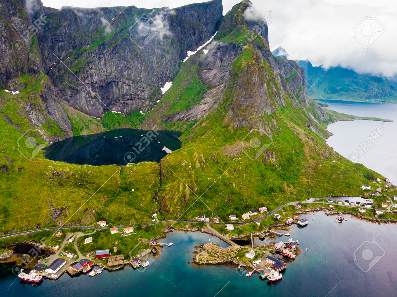 Aerial View On Reine Village And Mountain Lake Reinevatnet, Moskenesoya Lofoten Islands Norway. Travel Destination. Фотография, картинки, изображения и сток-фотография без роялти. Image 127762794