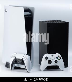 PlayStation 5-Game-Controller auf blauem Designhintergrund isoliert. Schwarz-Weiß-Joystick für die Gaming-playstation Five. Sony ps5 Gamepad aus nächster Nähe Stockfotografie - Alamy