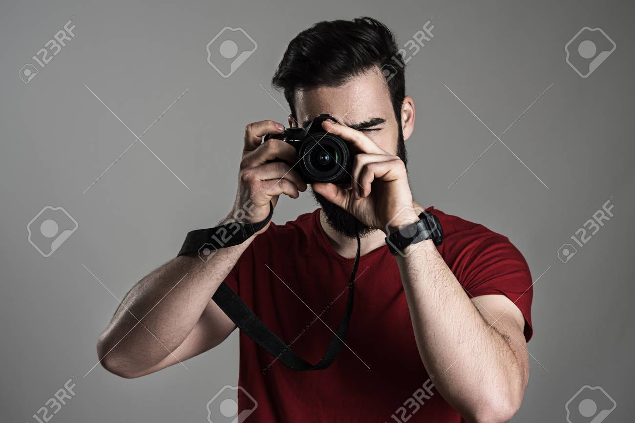 Junger Männlicher Fotograf, Der Foto Mit Weißer Fokussierender Linse Der Digitalen Slr Kamera Über Grauem Studiohintergrund Macht Lizenzfreie Fotos, Bilder und Stock Fotografie. Image 65252969.
