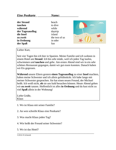 Eine Postkarte: German Reading Postcard - Reisen / Urlaub (Perfekt) | Teaching Resources