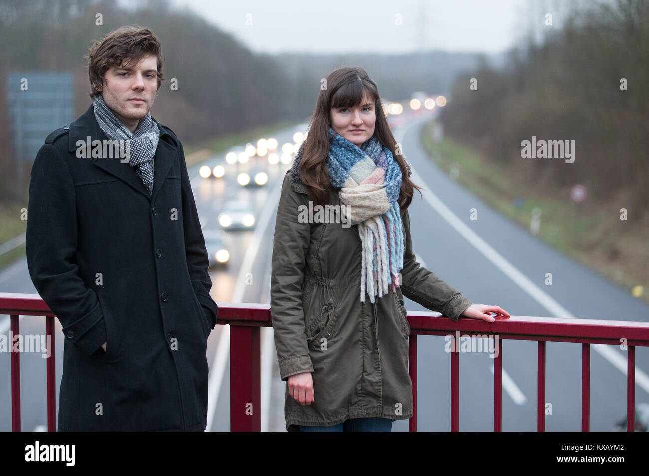 Die Filmemacher Emanuel Zander-Fusillo (L) und Elena Walter stand auf der Autobahn Brücke in Osnabrück, Deutschland, 04. Januar 2018. Ihr Video chaulustige · Sei kein Gaffer" (Lit. "Zuschauer - nicht eine gawker)