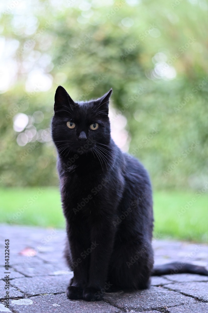 Auf dem Fußweg unter einem großen blühenden Strauch sitzt eine schwarze Katze. Sie hat ein weißes Lätzchen und schaut neugierig zu mir herüber. - ein lizenzfreies Stock Foto von Photocase