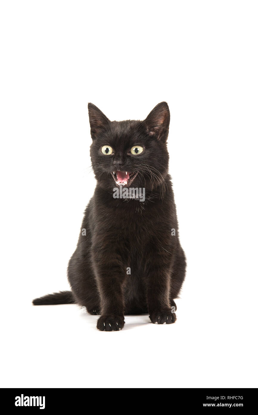 Schwarze Katze sitzt auf dem Boden und gähnt Stock-Foto | Adobe Stock
