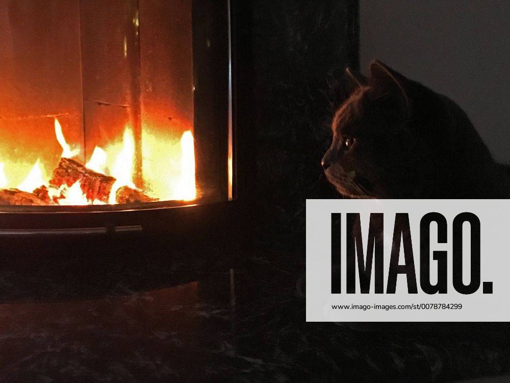 Schwarze Katze sitzt vor Kaminfeuer McPALX