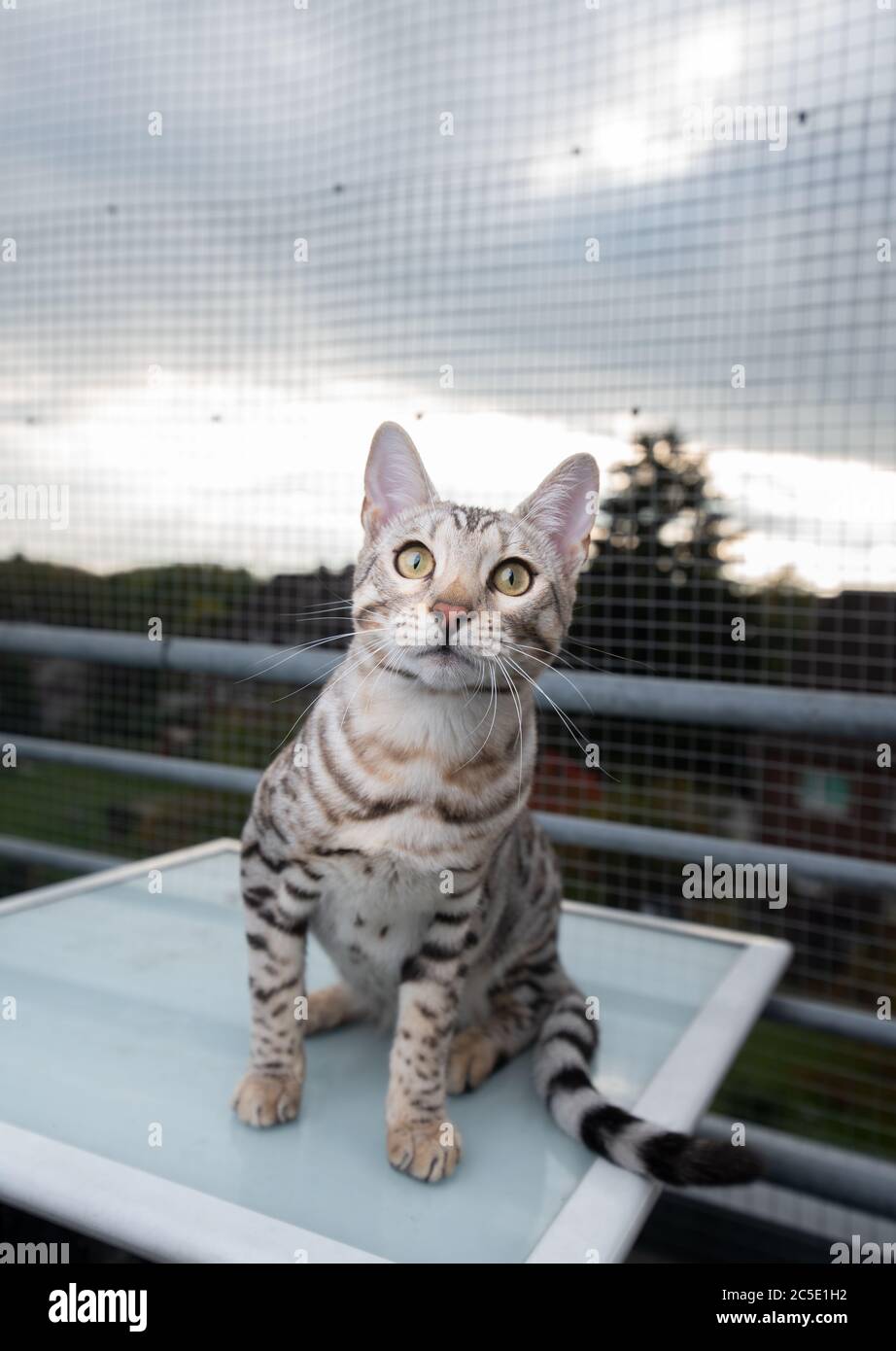 Neugierige junge schwarz silber gestromte bengalkatze, die auf dem Tisch draußen auf dem Balkon vor dem Sicherheitsnetz sitzt und auf die Kamera schaut Stockfotografie - Alamy